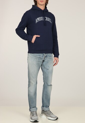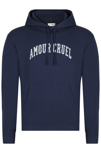 В новой коллекции Энтони Ваккарелло представлено худи прямого кроя с карманом-кенгуру. Дизайнер марки, основанной Ивом Сен-Лораном, украсил модель цвета ночного неба крупной надписью «Amor Cruel», которая выглядит слегка потертой, словно со временем. Для создания этого худи использовался высококачественный плотный хлопковый трикотаж, который обеспечивает оптимальную температуру и сохраняет свой вид даже после длительного использования. Эта модель станет важным элементом базового гардероба, идеально сочетаясь с джинсами и кроссовками для создания стильного и удобного образа.